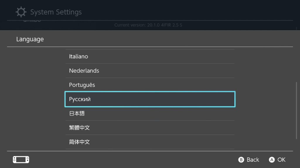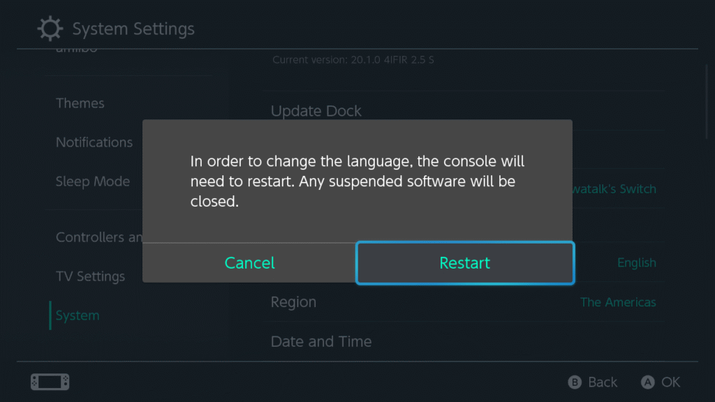 - “In order to change the language, the console will need to restart. Any suspended software will be closed.” (Dili değiştirmek için konsol yeniden başlatılması gerekir. Askıya alınmış yazılımlar kapatılacak) uyarısı görünecek