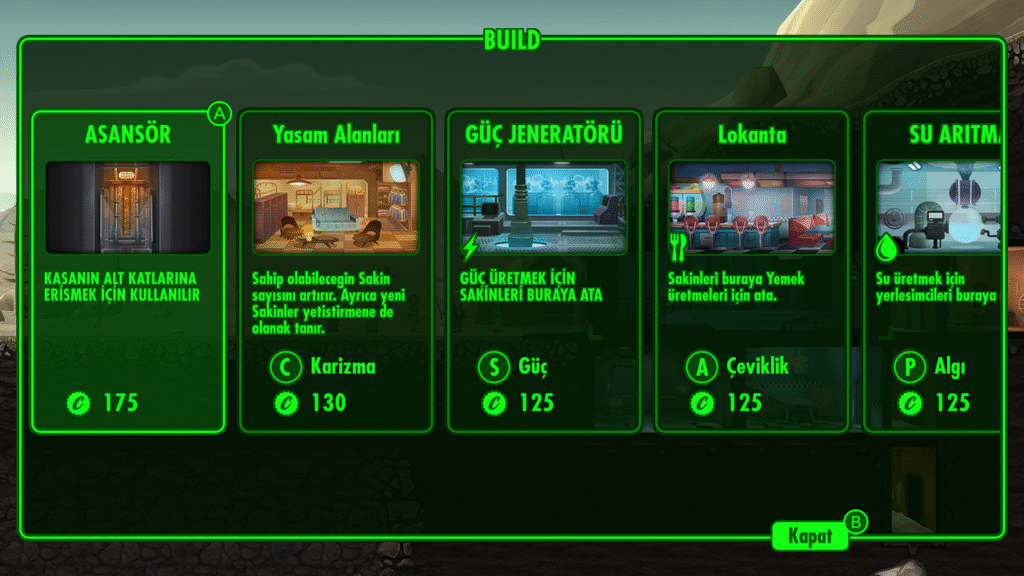 - Sakin (Dweller) Yönetimi: Her sakinin kendine özgü S.P.E.C.I.A.L. (Strength, Perception, Endurance, Charisma, Intelligence, Agility, Luck) istatistikleri vardır. Bu istatistiklere göre onları uygun işlere atayarak verimliliği artırabilirsiniz.