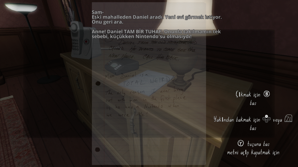- Doğrusal Olmayan Keşif: Evin belirli bölgeleri kilitli olsa da, hikaye parçalarını bulma sırası genellikle oyuncunun keşfine bağlıdır.