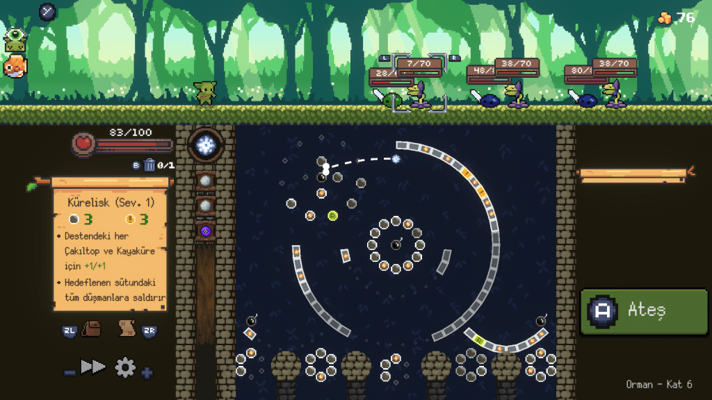 • Pachinko Mekaniği: Düşmanlara hasar vermek için topları (orb) çivilere (peg) çarptırarak ilerliyorsun.