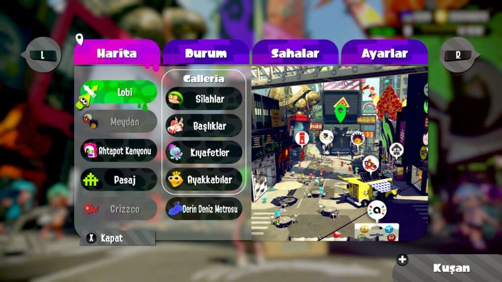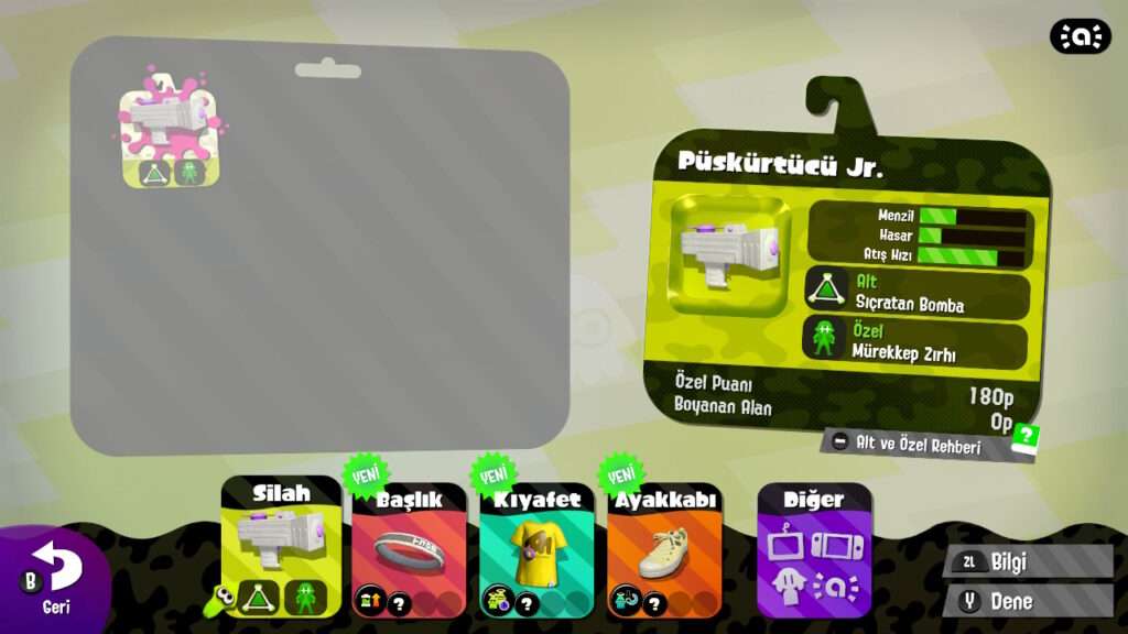 - Silahlar ve Ekipmanlar: Farklı oyun stillerine hitap eden çok sayıda silah (Splattershot, Charger, Roller) ve özelleştirilebilir giysiler (kafa bandı, kıyafet, ayakkabı) mevcuttur.