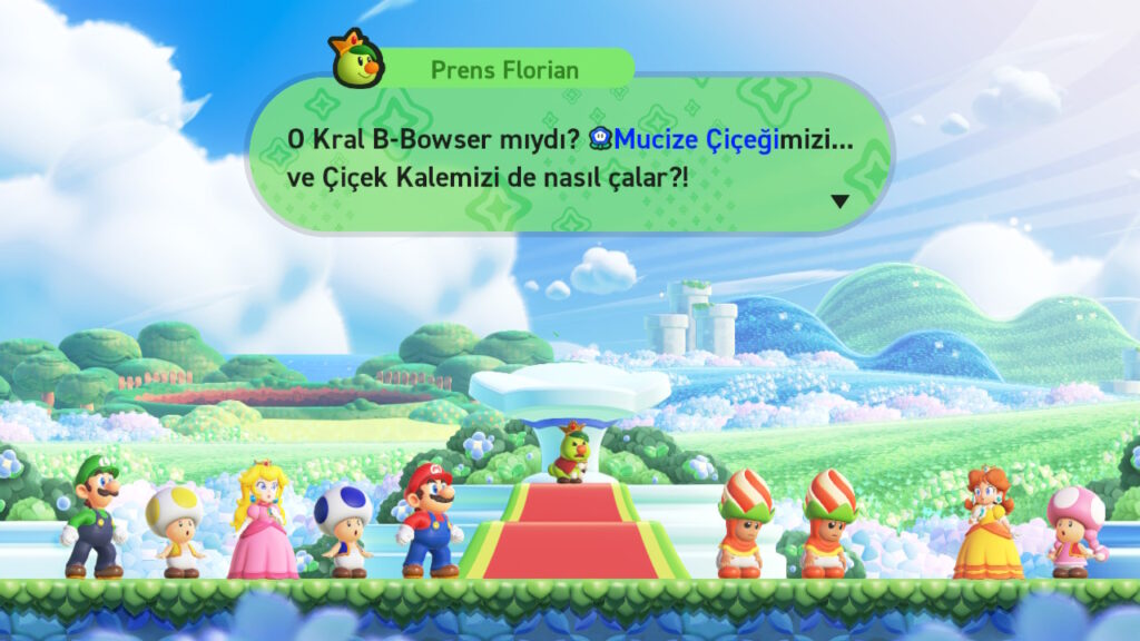 - Ancak kötü kalpli Bowser, krallığın gizemli “Wonder Flower” (Harika Çiçek) gücüne dokunarak kendi kalesiyle birleşir ve devasa bir uçan kaleye dönüşür.